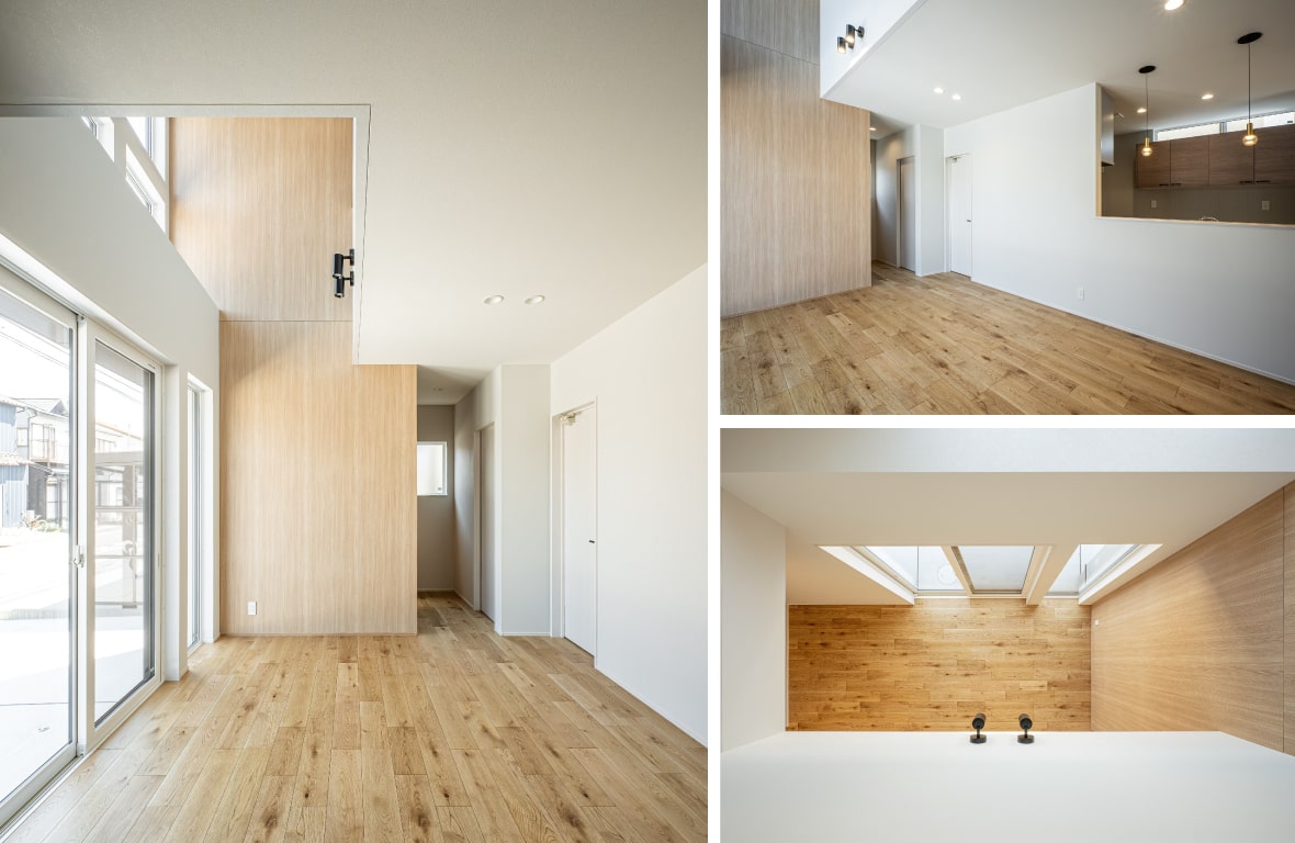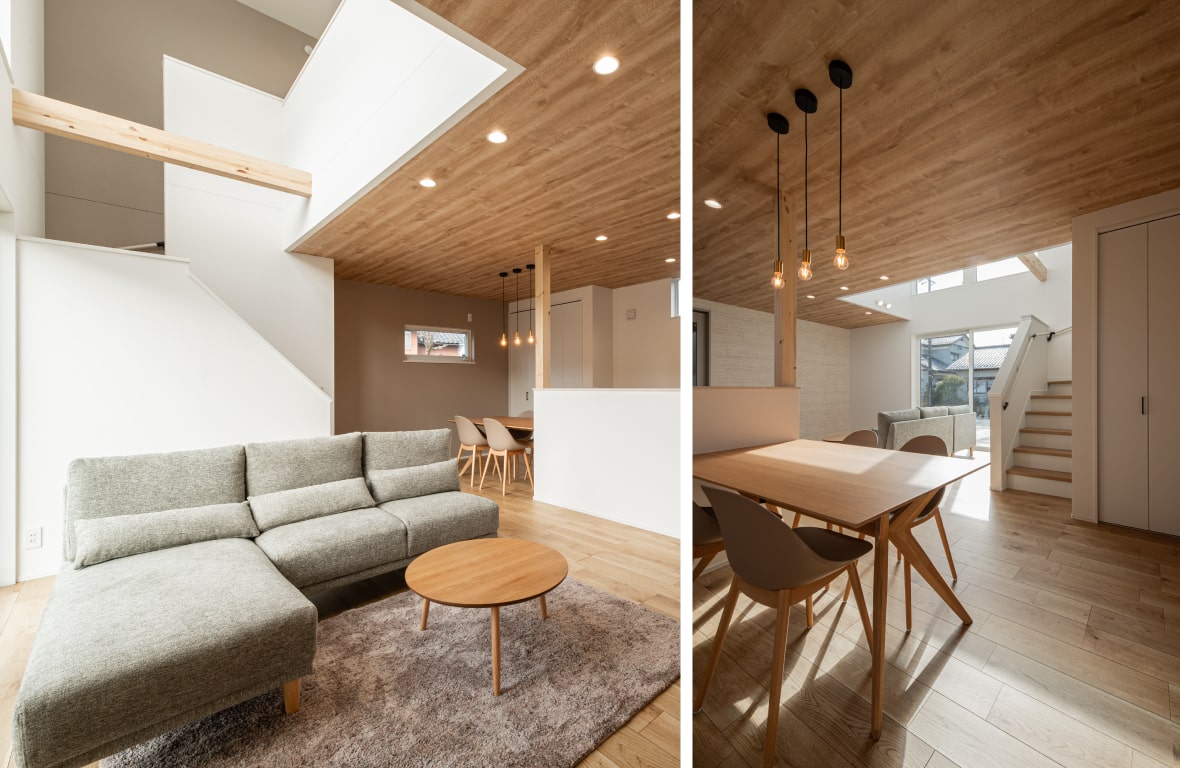 天井には木目調のクロスが施されており、自然な温かみと落ち着きのある雰囲気を演出しています。化粧梁がアクセントとして設置されており、空間に立体感とデザイン性をプラス。吹き抜け部分に設けた窓から間接光が柔らかく室内に入り込み、明るく温かみのある雰囲気を作り出しています。