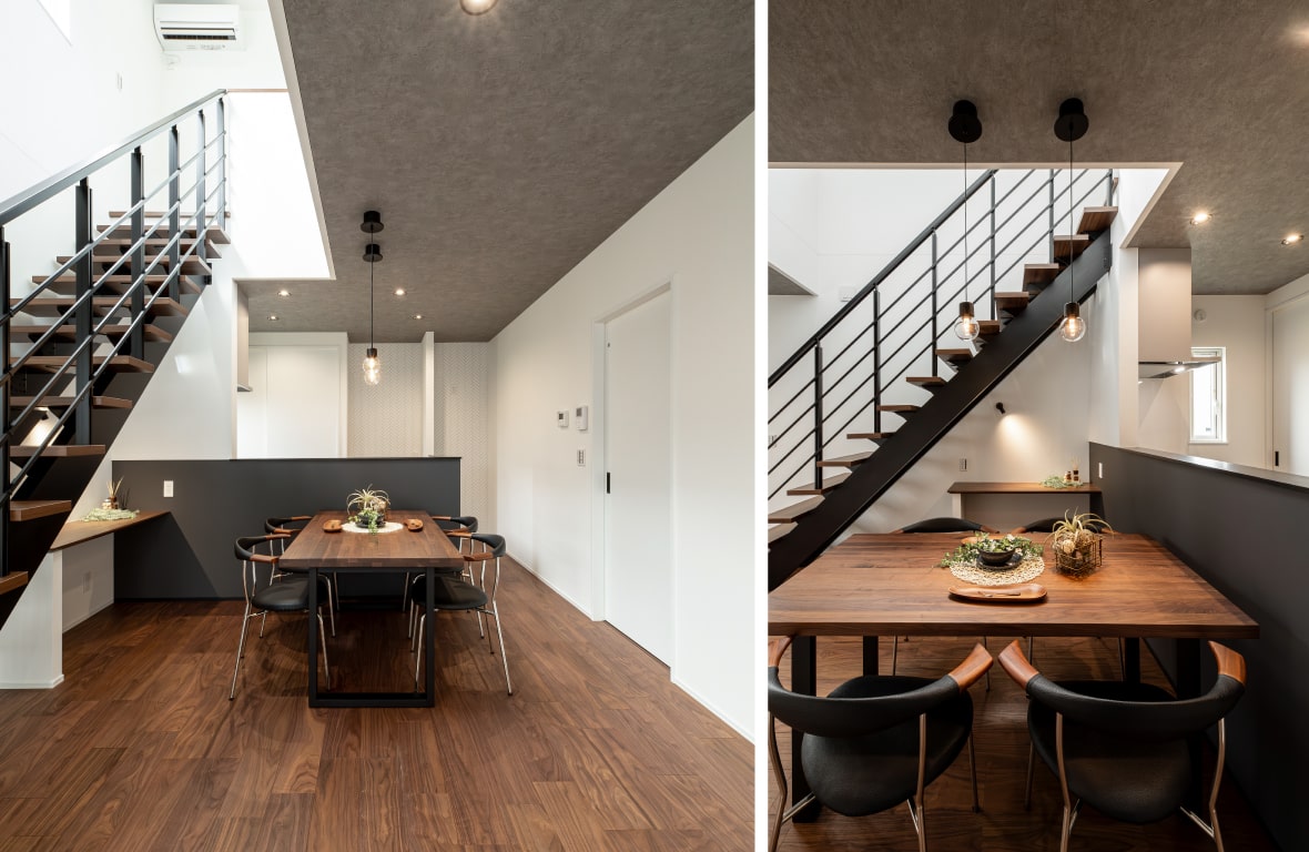 明るく開放的な印象を与える吹き抜けのリビングは、自然光がたっぷりと差し込み、居心地の良い空間を演出します。また、階段ホールをスキップフロアに設計することで、空間にリズムや動きが生まれ、視覚的なアクセントとなります。これにより、空間全体に広がりと奥行きが感じられ、より一層開放感を感じられるように。さらに、スキップフロアは家族間のつながりを自然に促し、コミュニケーションもスムーズに行えるメリットがあります。