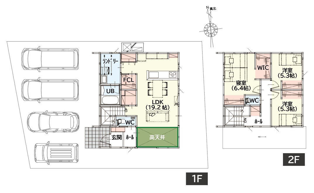 敷地内は4台以上の駐車に対応しており、2台並列+来客用など柔軟な使い分けが可能。