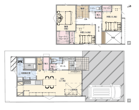キッチン横のパントリーや大容量の階段下収納、各個室のクローゼットなど分散型の収納もモノがしっかりと仕舞えて便利です。必要な場所に必要な収納があることで、片付けの手間が減り、居室の広さをそのまま体感できます。日々の送り迎えや週末の買い出し、来客の多い日も動線にも余裕が生まれます。