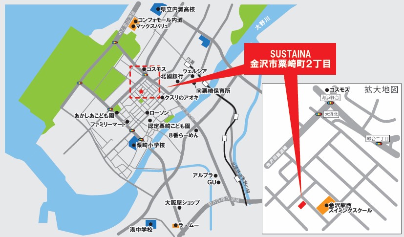 - 北陸鉄道「粟崎四丁目」バス停 …230m(徒歩3分)