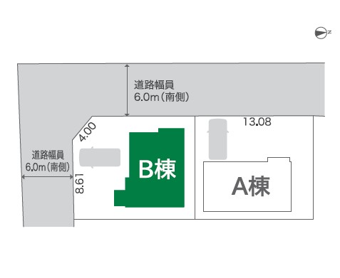 | 接道状況 | 前面道路:(南側)6.0・(西側)6.0m、間口:(南側)12.61m(隅切部分含む) | ||