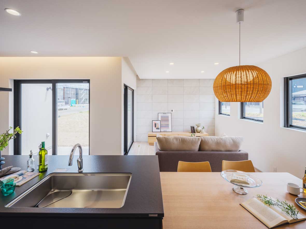 内観は白と木目をベースに、テレビ面の壁にはタイル柄の壁紙でアクセントをプラスし、全体にシャープかつバランスの取れた印象を演出しています。
