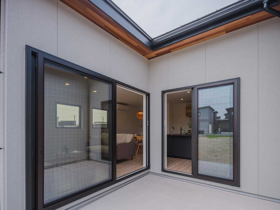 コの字型の間取りで中心にテラスを設け、人目を気にせずBBQやくつろぎの時間が楽しめます。