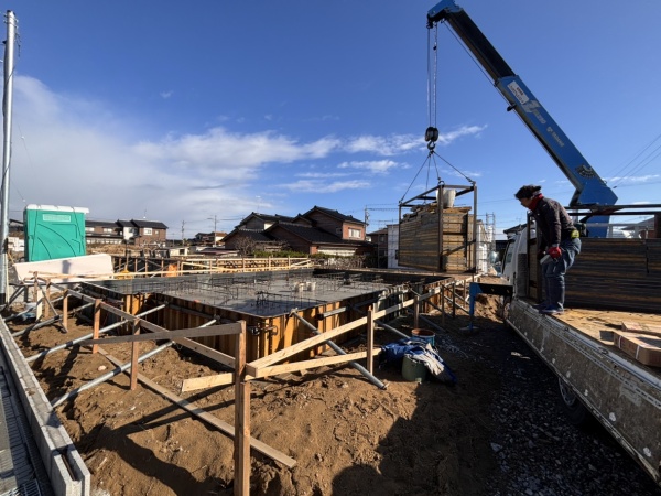 さて、本題に戻りますがお家の基礎となる部分の工事にとりかかる段階の、耐圧盤基礎の打設が終わりこれからコンクリートを打設に移ります。