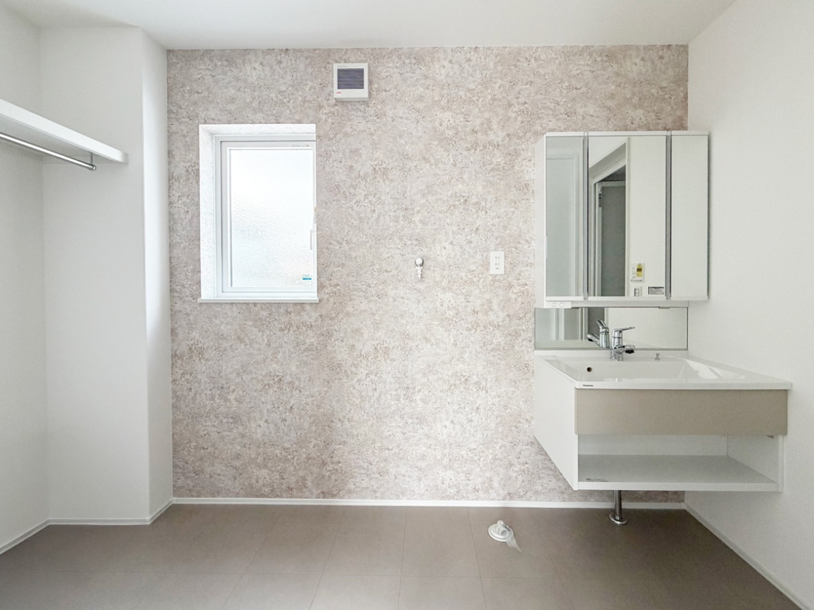 クロークを備えた洗面脱衣室&ランドリールーム。アクセントクロスは浴室と合わせて統一感をもたせています。