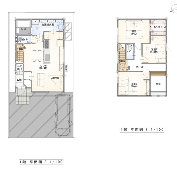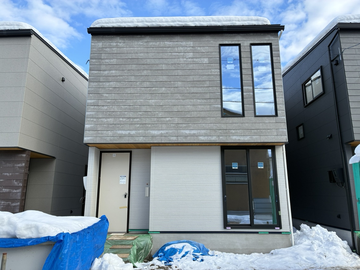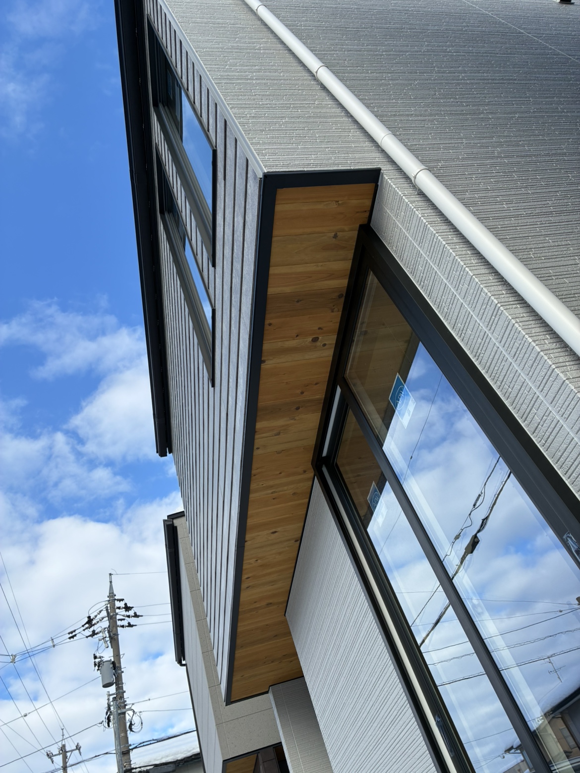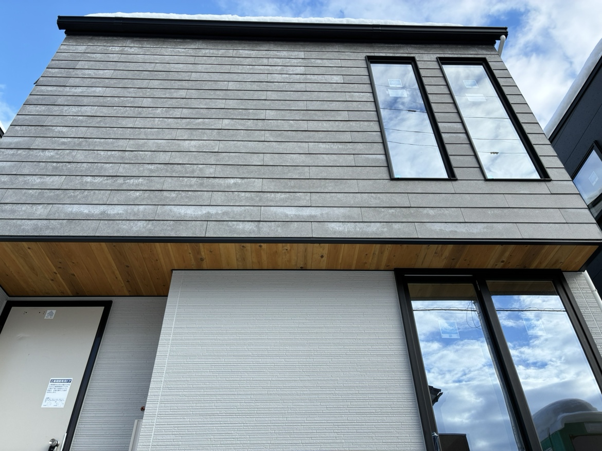 下部は清潔なホワイトカラー、上部にはソリッドタイル調の外壁材をアクセントにしています!
