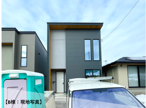 【B棟】フラットデザインのブラックカラーの外壁を基調に、吹付材と天然木が上質な素材感を織りなすクールモダンなデザインです。