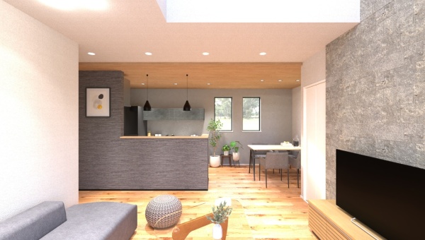 やわらかなグレーのアクセントクロスが落ち着きを添え、広く巡る木目の下がり天井がLDKに温もりあるリッチな雰囲気を演出します。