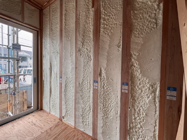 今回の進捗でご紹介するのが、高性能住宅を作るにあたり、高気密・高断熱に不可欠な吹付け発泡ウレタン材です。