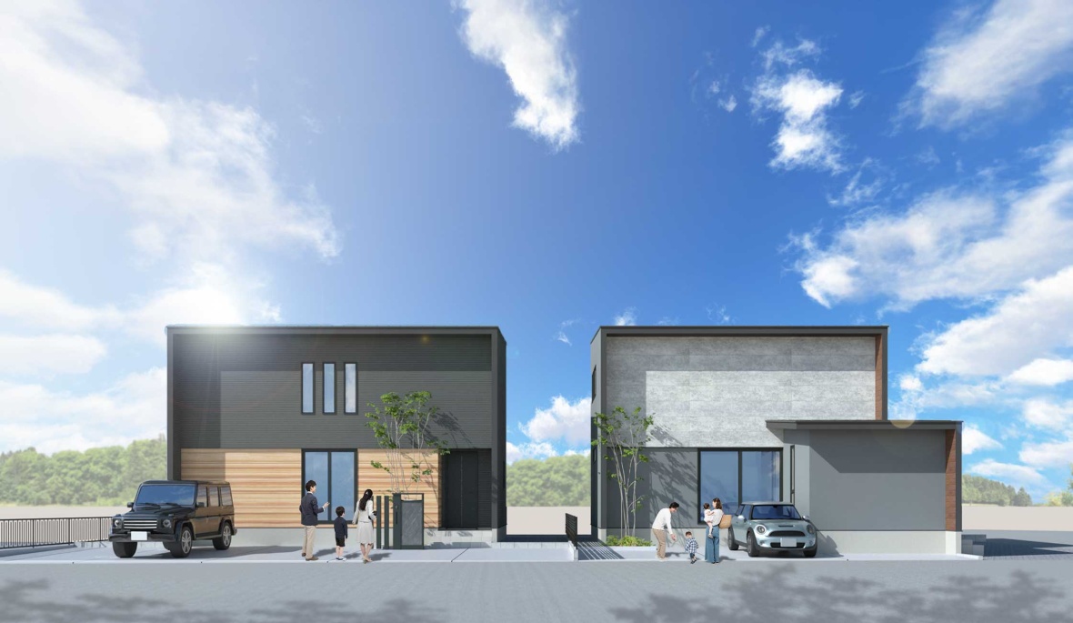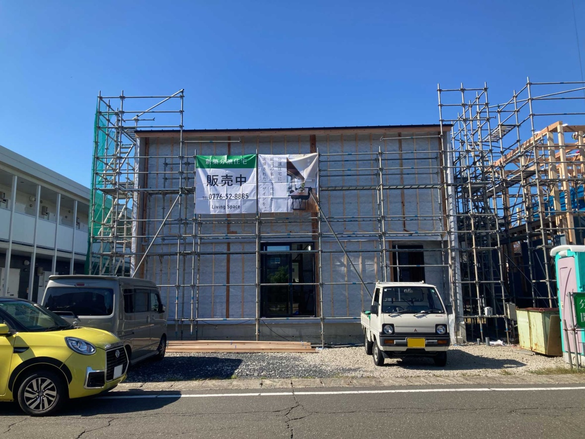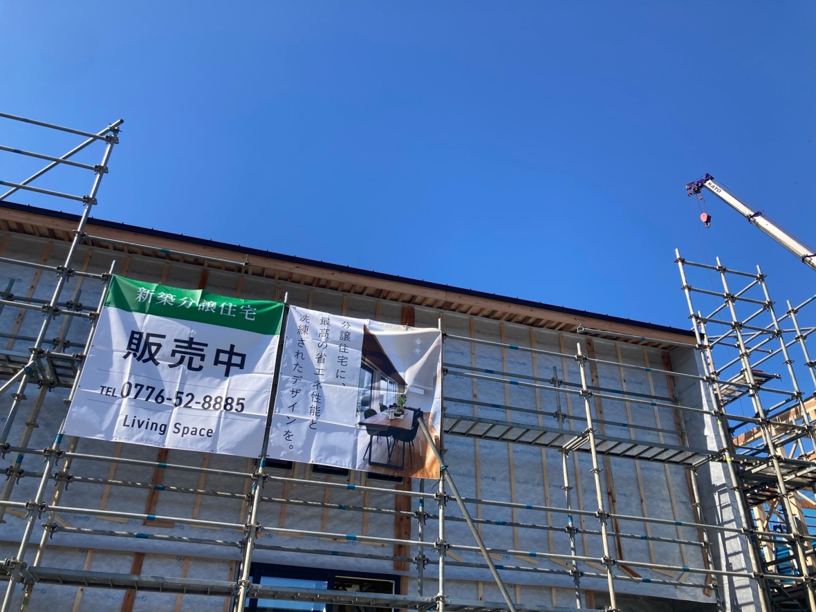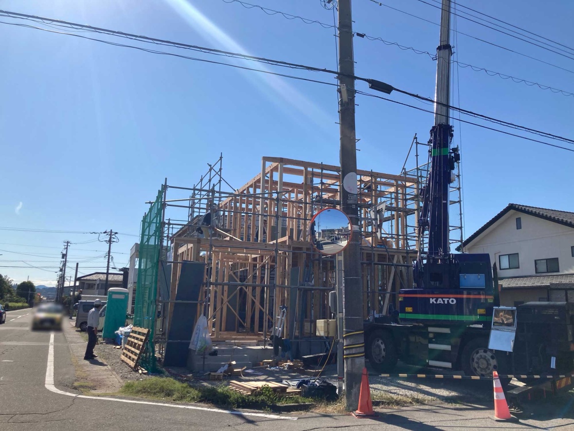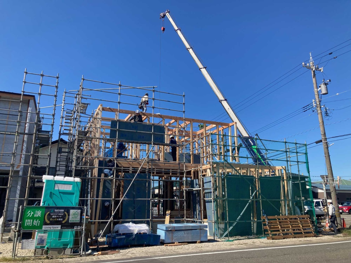先日B棟(南側)の上棟が完了し、本日A棟(北側)も快晴の中上棟作業中です♪