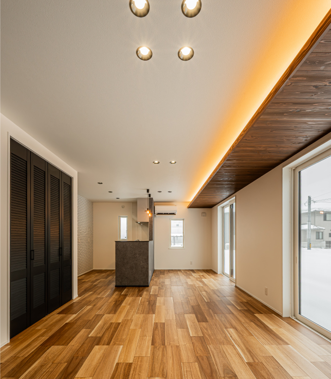 ゆとりある20帖の広々LDK。木目が美しいダイナミックな下がり天井に、ライン照明を仕込んだこだわりの住まいです。