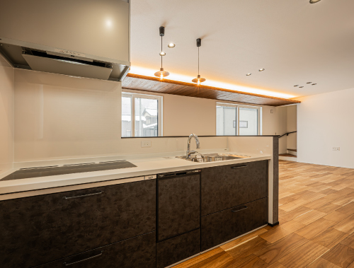 リビングの主役は、木目が美しいダイナミックな下がり天井。そこに仕込まれたライン照明が、ただ部屋を明るくするだけでなく「心地よい陰影」を描き出し、開放感と落ち着きが共存する上質な空間を演出します。
