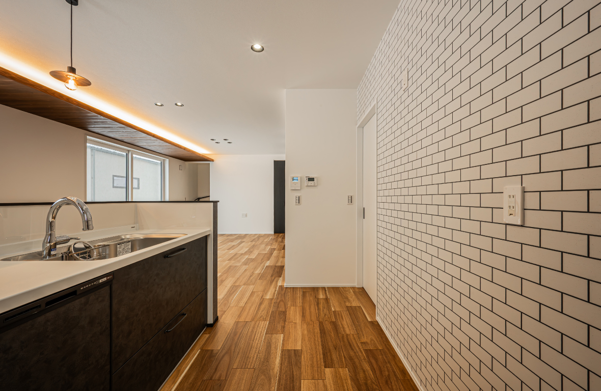 白を基調としたクリーンな空間に、ブラックのアクセントを随所に配置。 強くなりがちな「黒」を、木目やタイル調クロスと掛け合わせることで、無骨さと洗練さが同居する、唯一無二の住まいが完成しました。