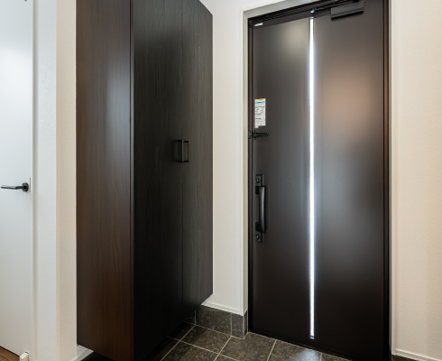 縦長のガラススリットが特徴的なリビングドアも魅力のひとつ。重厚なカラーリングでありながら、視線が奥へと抜けることで圧迫感を抑え、隣室からの光を優しく取り込みます。 -