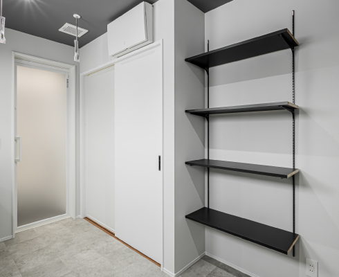 収納扉には、繊細なラインが美しいルーバー(鎧戸)タイプを採用。平坦になりがちな壁面に立体感と規則的なリズムを与え、海外のレジデンスのような洗練された表情を作り出します。