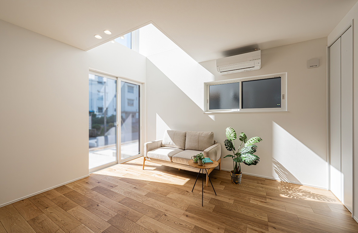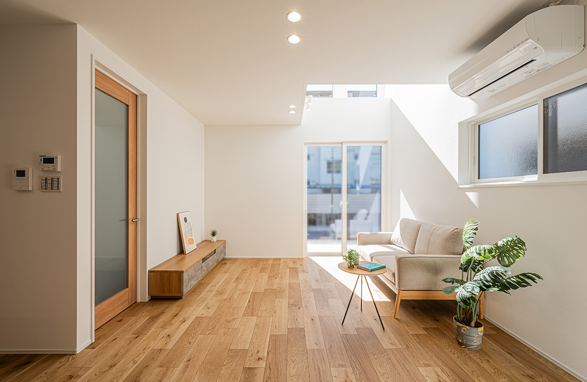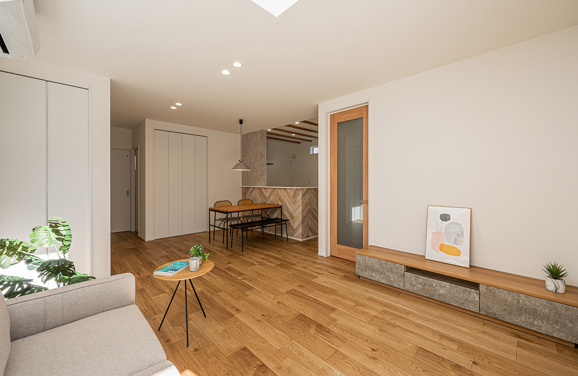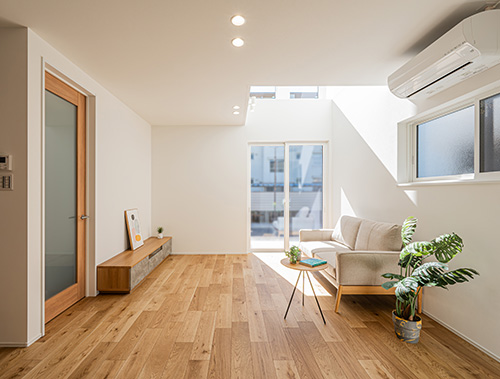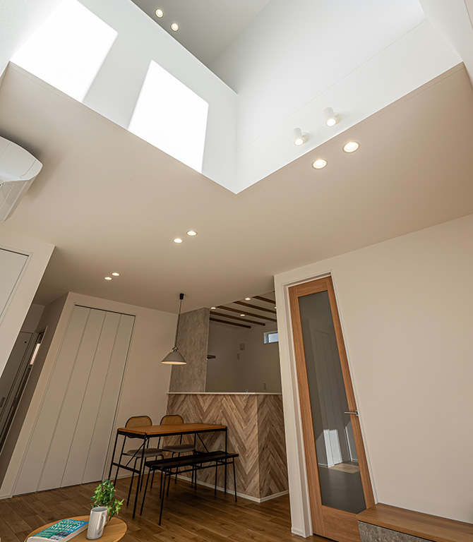 LDKに吹抜を設ける事で、間接光が安定的に採りこめ明るく開放的な空間になります。帖数以上の広がりを感じます。吹抜のハイサッシからたっぷりと光が射し込み、LDK全体が明るくなります。
