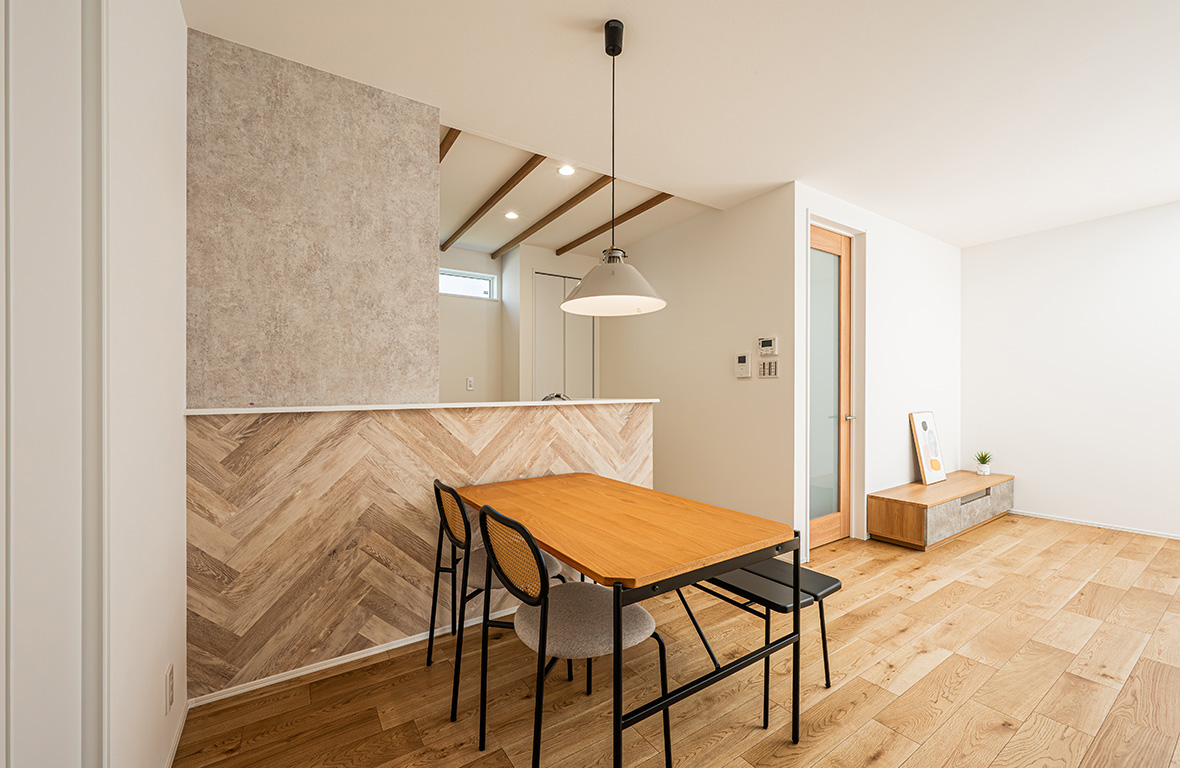 キッチンの上を折り上げ天井にして、その部分に格子を設置することで空間を引き締めながらも、ぬくもりを感じさせる内観デザインです。
