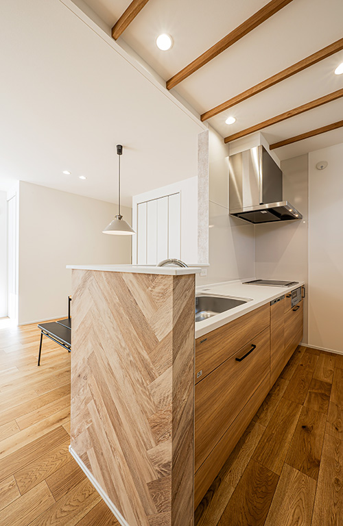 キッチンの折り上げ天井の格子が、空間に美しいリズムと奥行きをもたらします。直線が描く規則性が空間を引き締めて、柔らかな温もりも感じさせてくれます。日常の中にさりげない美しさをプラスした住まいです。