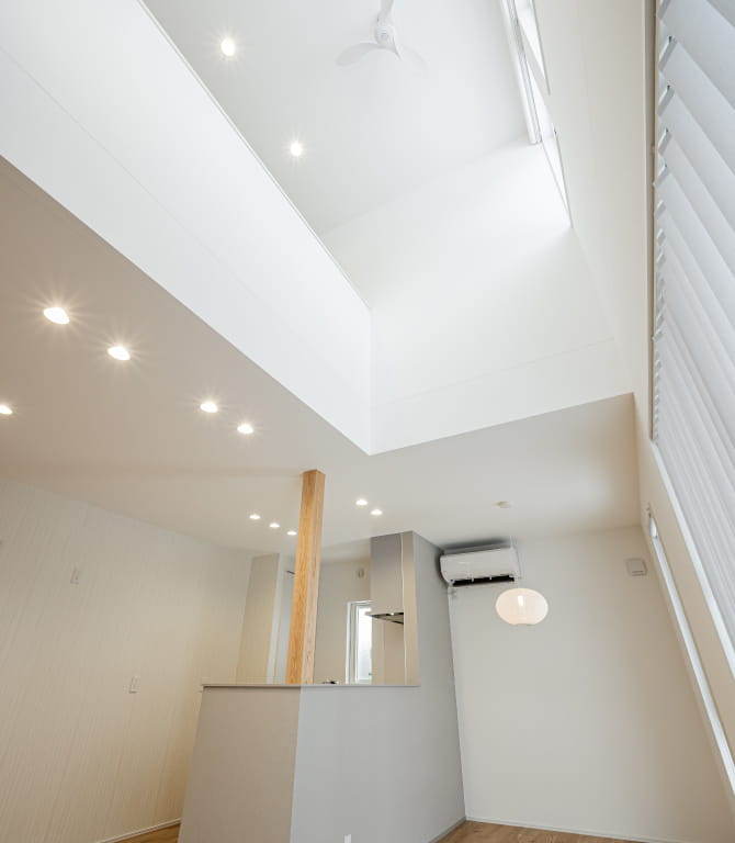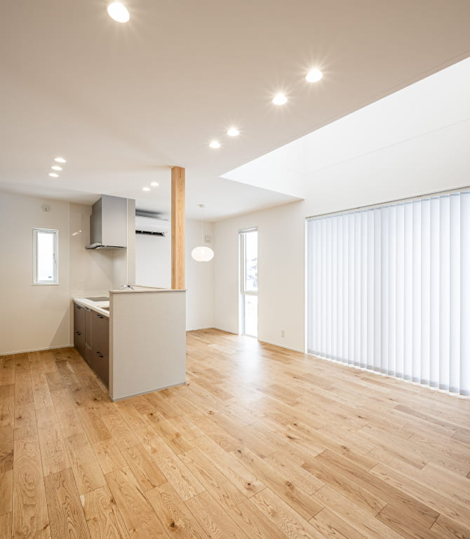 南向きの大きな吹抜けから、たっぷりの陽光が降り注ぐLDK。北欧ナチュラルのインテリアで統一された室内は、木の温もりと光が溶け合い、家族を優しく包み込みます。