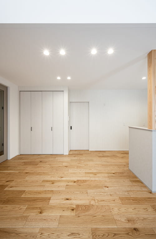 内装の主役は、明るいナラ樫フローリングと、空間を優しく引き締める木の柱。ベースカラーをホワイトでまとめ、本場北欧のような「温かみのあるシンプルさ」を追求しました。