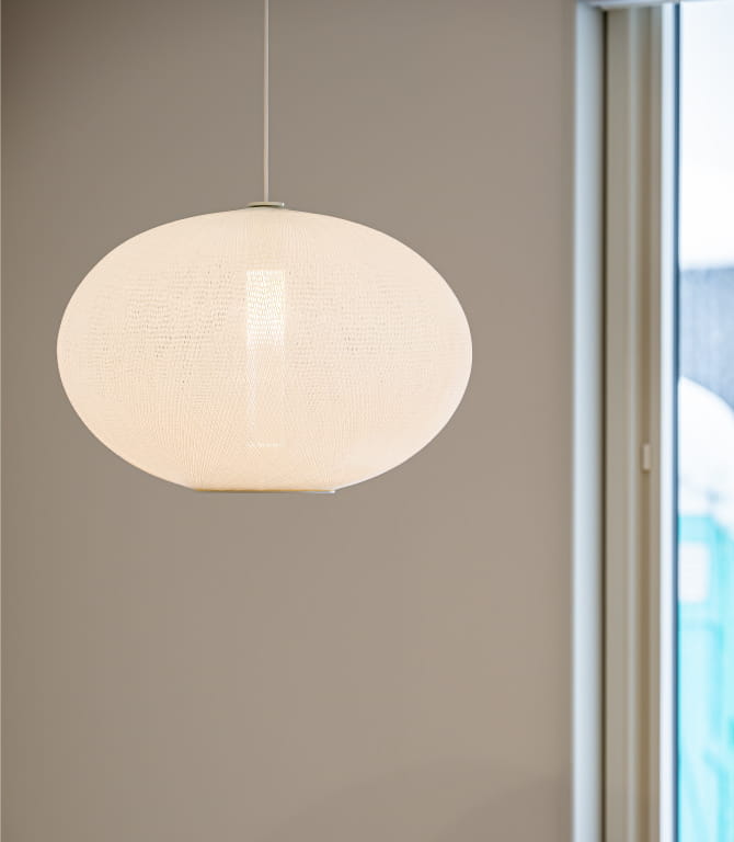 ダイニングを彩るのは、和紙のような質感が美しいペンダント照明。柔らかな光のラインが、北欧ナチュラルの柔らかな内装にそっと溶け込みます。