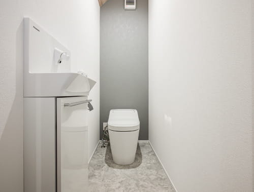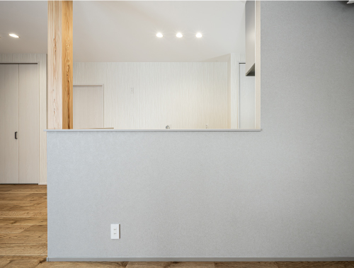 アクセントには、ニュアンスのあるブルーグレーやベージュ、木目クロスをセレクト。
