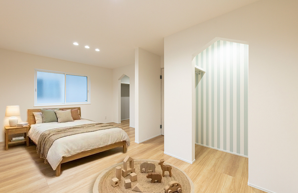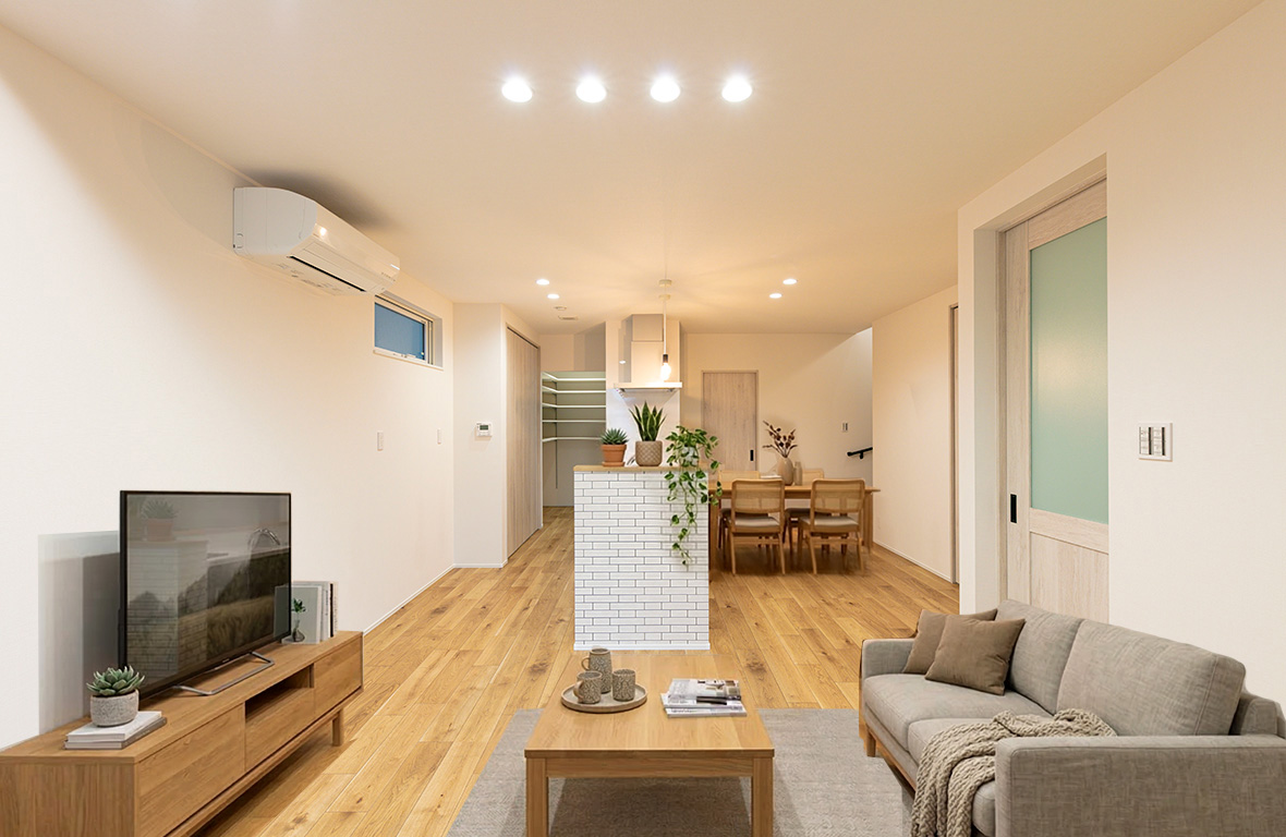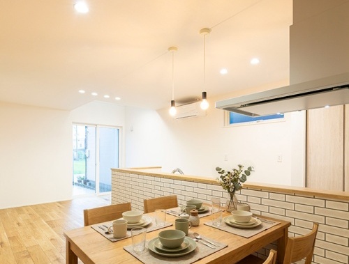 白を基調にした清潔感あふれる内観デザインに、キッチンの壁面をタイル調のアクセントクロスをセレクトすることで、シンプルな空間にほどよい素材感をプラスした住まいです♪また、キッチンには空間のアクセントとなるペンダント照明を配灯し、やわらかな灯りがタイルの質感を引き立て、日常のキッチン時間を少し特別なものにしてくれます。