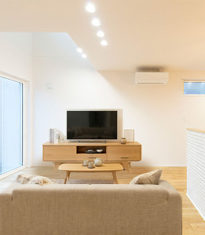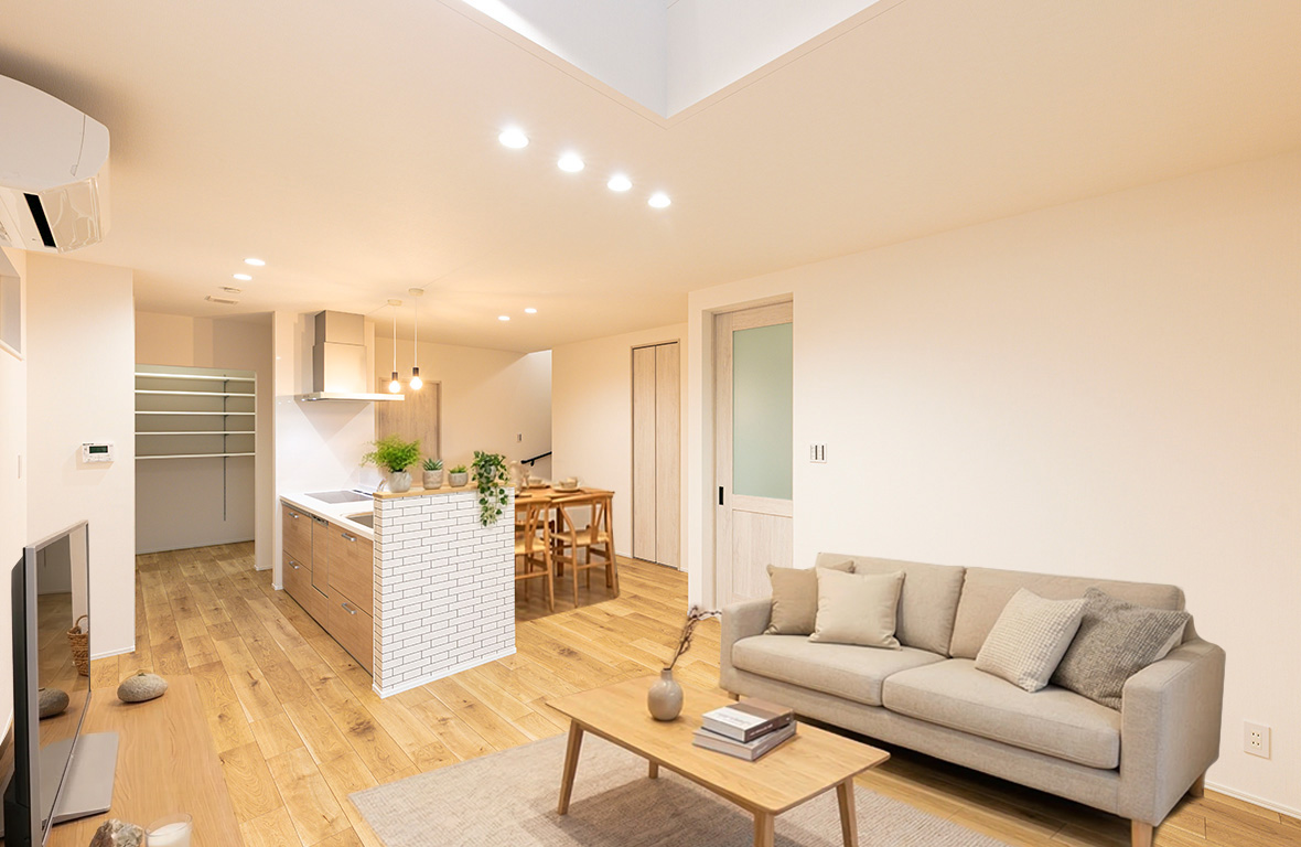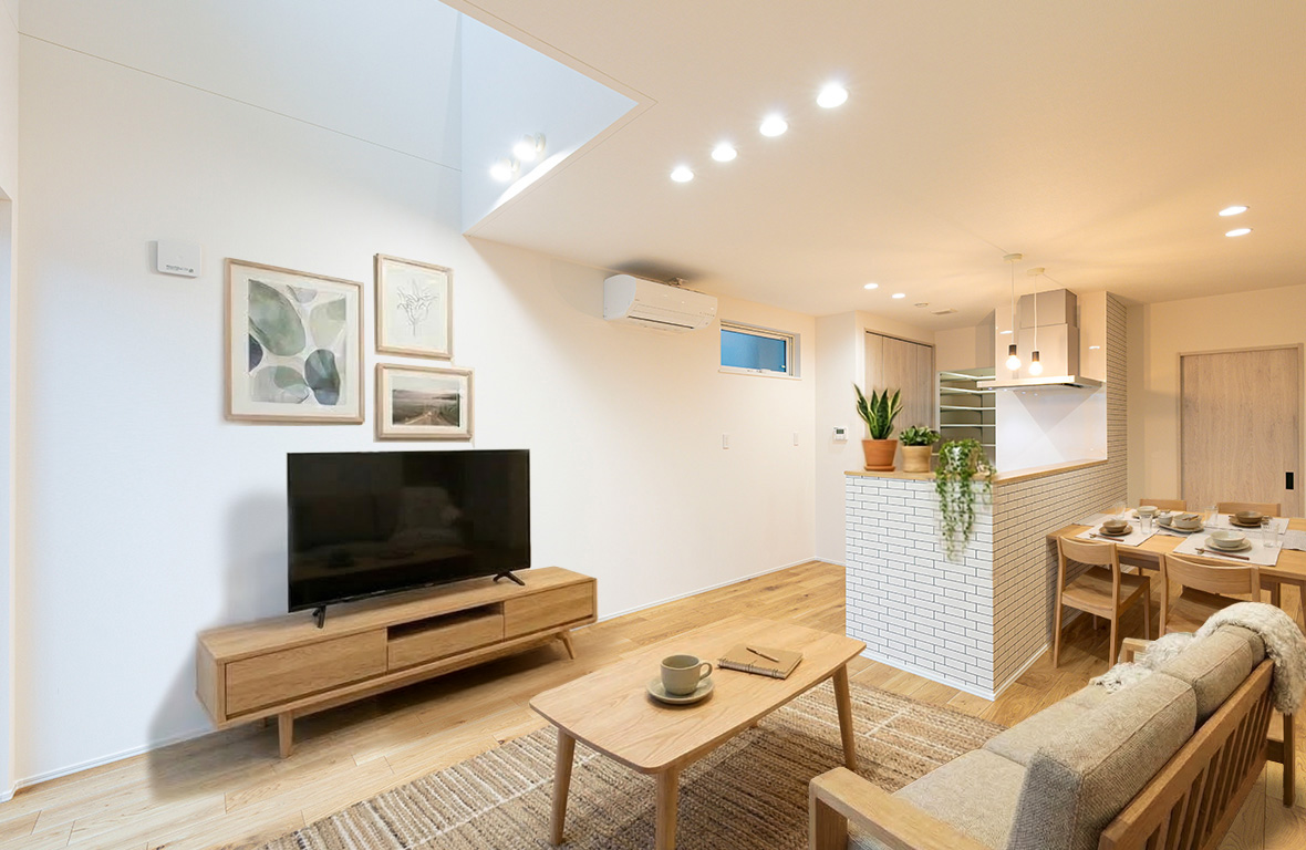 LDKに吹抜を設ける事で、間接光が安定的に採りこめ明るく開放的な空間になります。帖数以上の広がりを感じ、吹抜のハイサッシからたっぷりと光が射し込み、LDK全体が明るくなります。