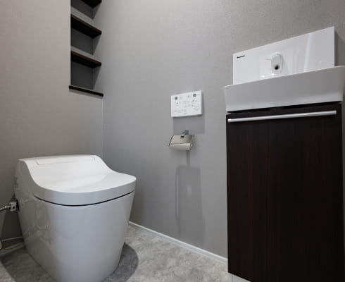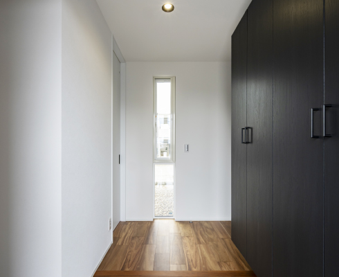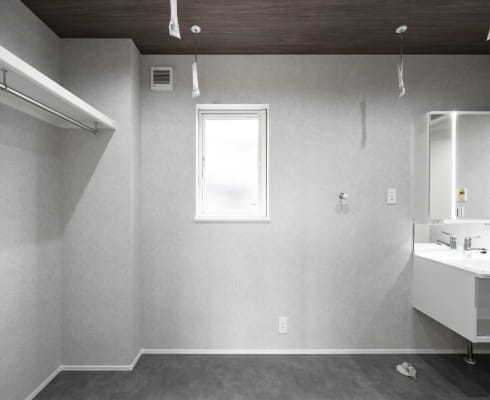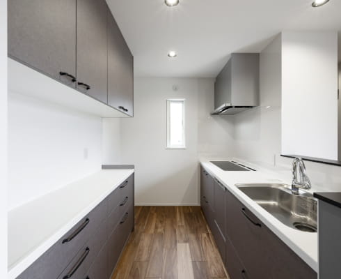 外断熱塗り壁「オメガシステム」を採用した、高い耐久性と意匠性を誇るアーバンモダンの住まい。グレイッシュな外観が街並みに調和しつつ、洗練された存在感を放ちます。内装はモノトーンで統一。テレビ背面に配したエコカラットは、調湿・脱臭機能に加え、間接照明が描き出す陰影でドラマチックな空間を演出します。光と影が織りなすコントラストを愉しむ、美しさと心地よさが共鳴する上質な邸宅をぜひご覧ください。