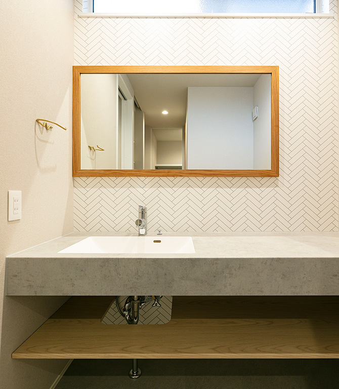 また、パブリックとして使用できる1階トイレと洗面化粧台には、こだわりのアイテムをセレクトしています。トイレ手洗いにはミラタップ、洗面化粧台にはアイカ工業のスマートサニタリーU、鏡はミヤモト家具に作成してもらった無垢枠のミラーを設置しました。パブリックスペースもラグジュアリーを意識して、ホテルライクな空間づくりとなっています。