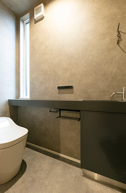 1階トイレにもミラタップの手洗いカウンターを設置し、細部まで選び抜かれたアイテムが、暮らしの中にさりげない贅沢をもたらします。