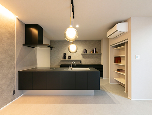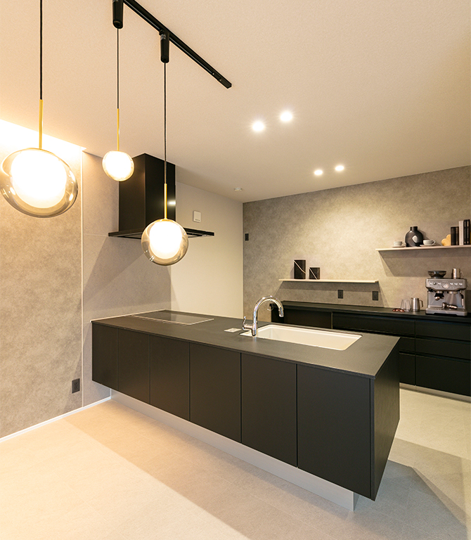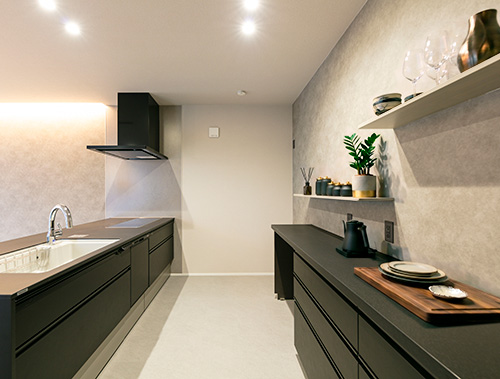 使いやすさはもちろん、佇まいも美しく、インテリアとして存在感を放つキッチンです。パナソニック「ラクシーナ」を採用し、ブラックの天板と面材でより洗練されたラグジュアリー感を演出しています。
