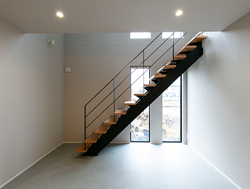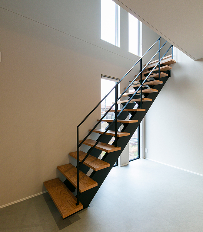 空間を遮らず、光と視線をやさしく通すアルミストリップ階段。LDKの空間に軽やかに佇むミニマルなデザインは、インテリアに自然と溶け込みながら、確かな存在感を放ち上質な暮らしを引き立てます。
