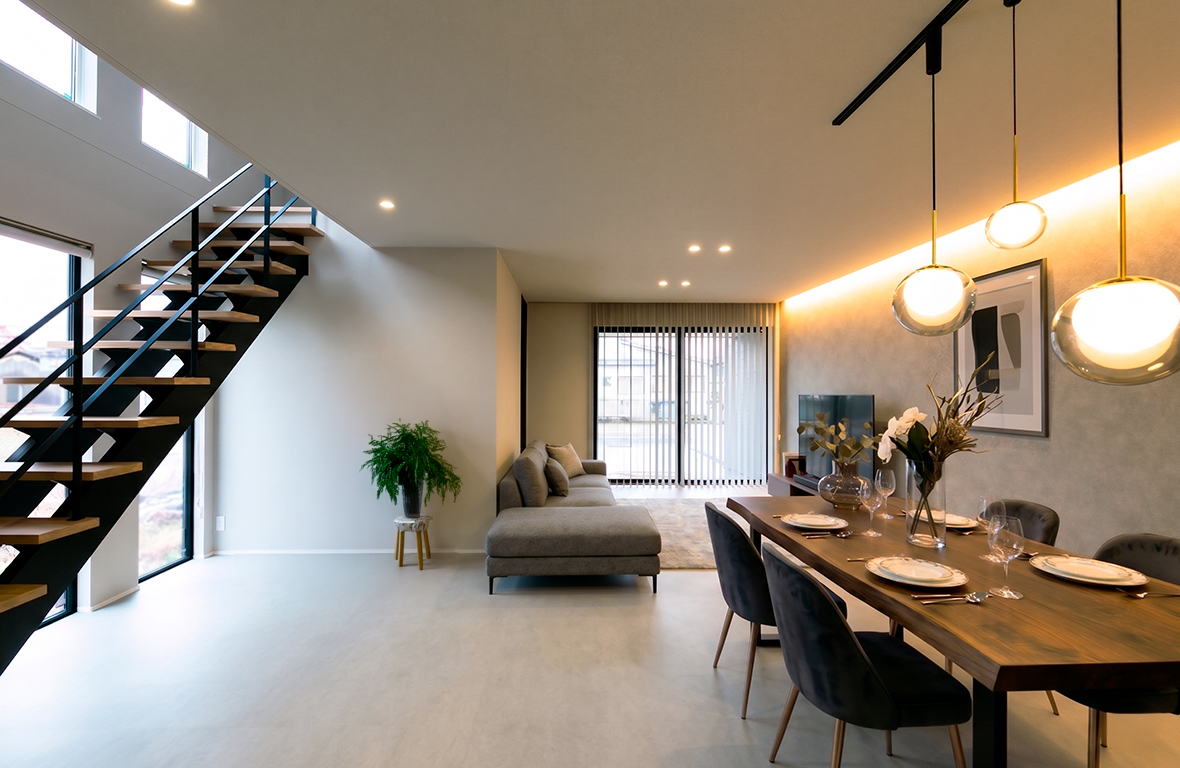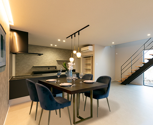 ホテルライクな住まいを望まれたお施主様、床材を無機質なフロアタイルにし、パナソニックのキッチン「ラクシーナ」が存在感を示し、アルミストリップ階段が抜け感を演出しラグジュアリーな住まいを実現しました。