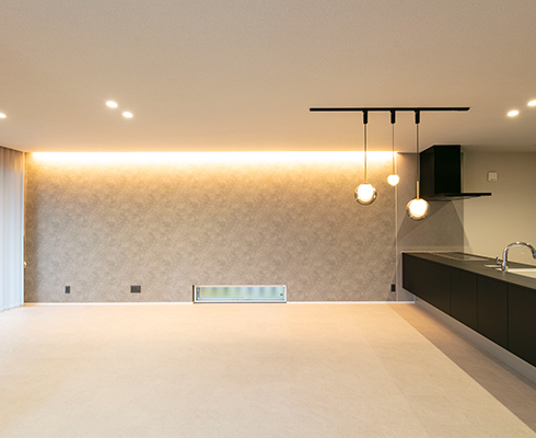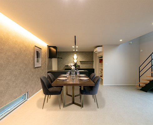 リビング・ダイニングにかけて間接照明を配灯し、奥行きを感じられるような視覚効果を演出しています。