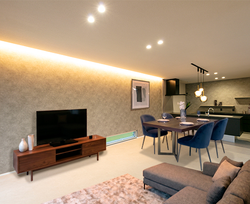フロアタイルの無機質さが高級感を生み出し、間接照明が穏やかな光のグラデーションが日常の中に非日常を感じさせる、ホテルライクなラグジュアリー空間を実現しました。間接照明が奥行きを感じさせてくれるため、LDKに入った時点で視覚効果で広く感じる事ができます。