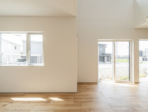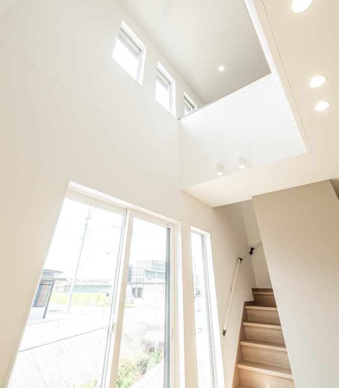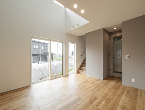 18.3帖のゆとりあるLDKには吹抜けを設け、モダンで落ち着きのあるデザインでありながら、自然光を取り込むことで温かみもあふれる空間が広がります。