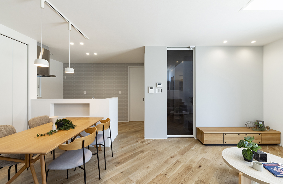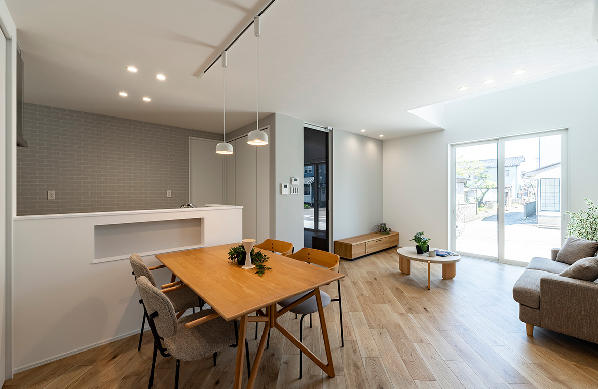 吹抜設計による開放的な空間づくりLDKに吹抜を設ける事で、間接光が安定的に採りこめ明るく開放的な空間になります。帖数以上の広がりを感じます。