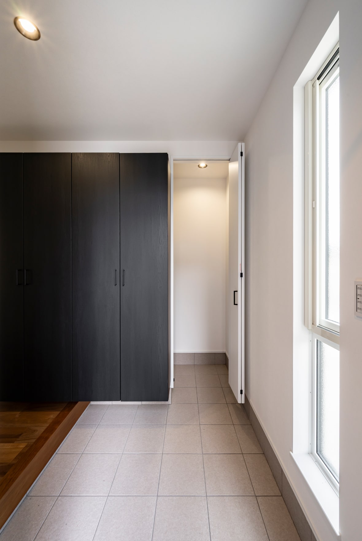 明るい光が差し込む広々とした玄関スペースは、自然な温かさと開放感を演出しています。玄関にはシューズクロークが設置されており、靴や履物を整理整頓できるだけでなく、すっきりとした印象を保つことができます。