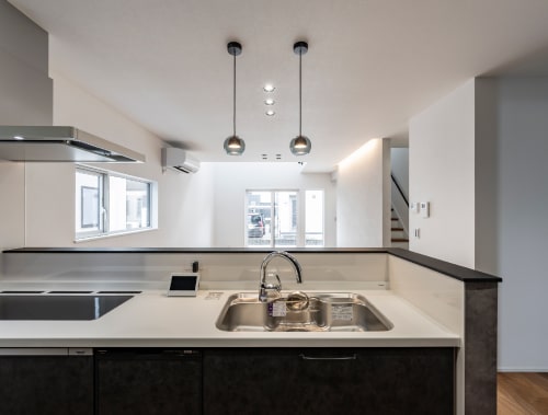 シューズクロークや土間収納で整理整頓しやすく、すっきりとした印象を保ちます。吹き抜けや間接照明により自然な明るさと温かみを演出し、ダークトーンの内装とデザイン性の高い照明が洗練されたスタイルを実現しました。