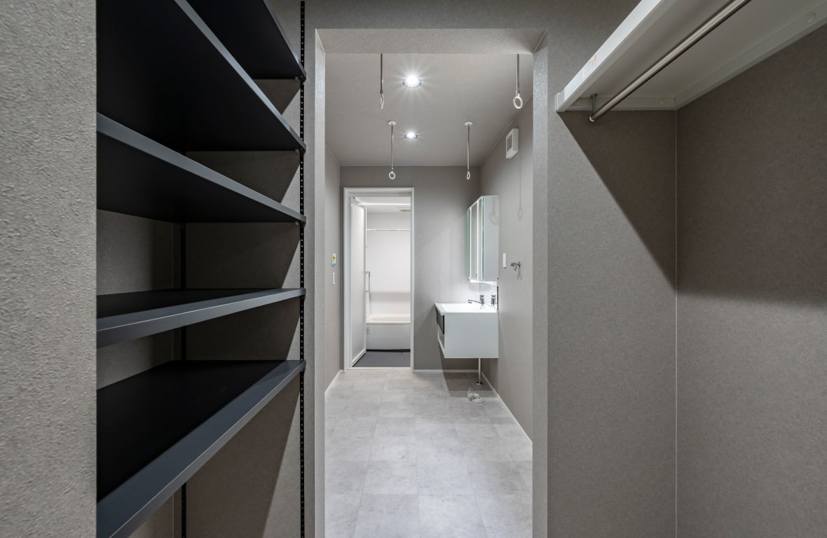 ランドリールームとファミリークロークを隣接させることで、洗濯から収納までの家事動線を短縮。さらに、各所に配置された収納により、生活空間を美しく保つ工夫も施されています。