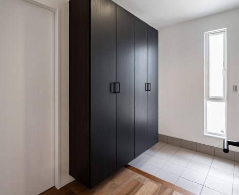 さらに、土間収納も備えており、ベビーカーやゴルフバッグ、アウトドア用品など、日常的に使用するアイテムを効率的に収納することが可能です。これにより、玄関周りは常に整然と保たれ、見た目もすっきりとした美しい空間を維持できます。扉を閉めることで収納部分を隠すことができ、生活感を抑えつつ、清潔感のあるエントランスを実現しています。 -