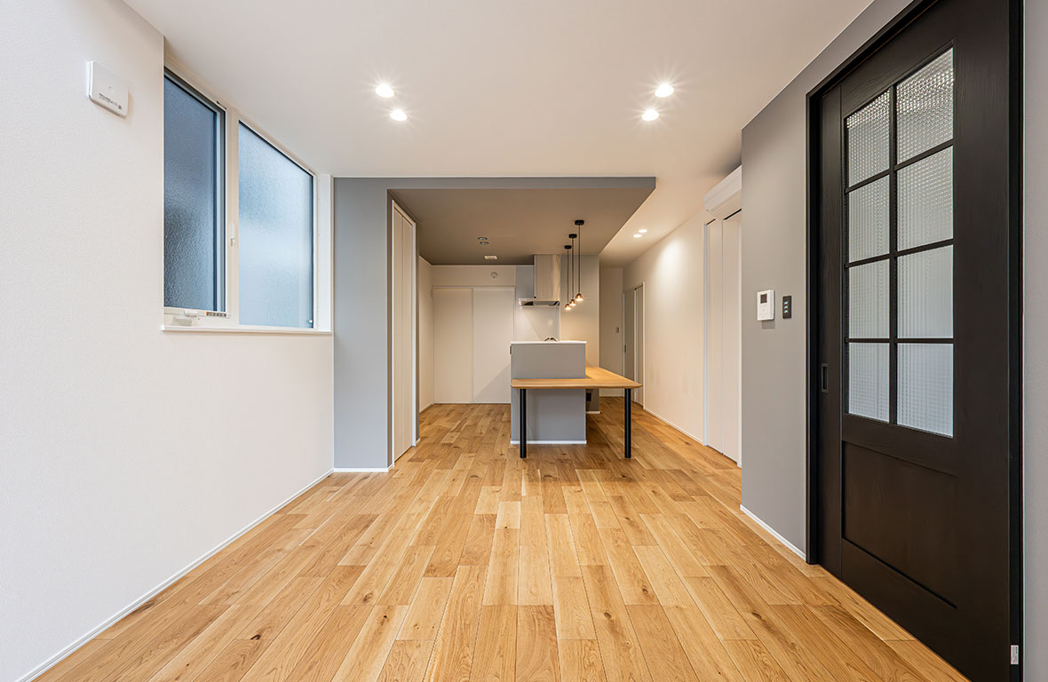 1階に造作キッチンカウンターを備え付け、ダイニングスペースを有効活用できるような間取りです。