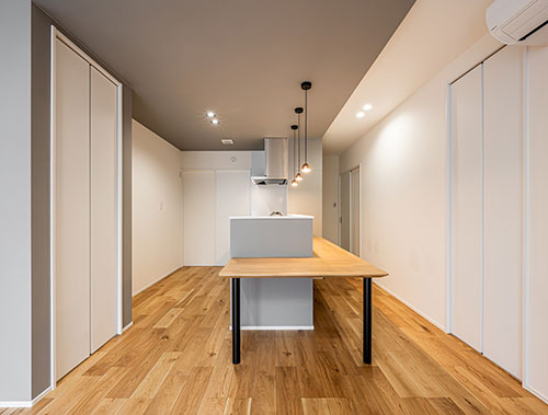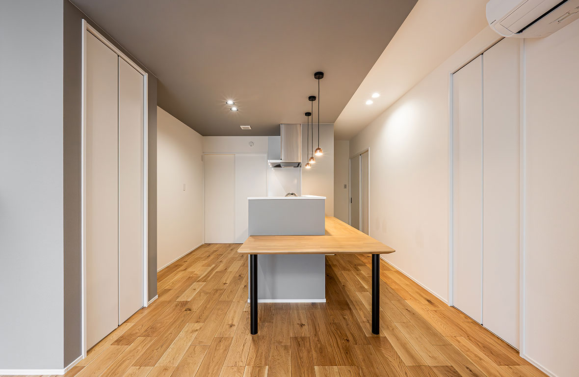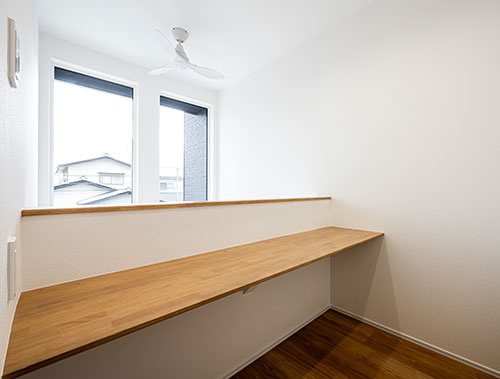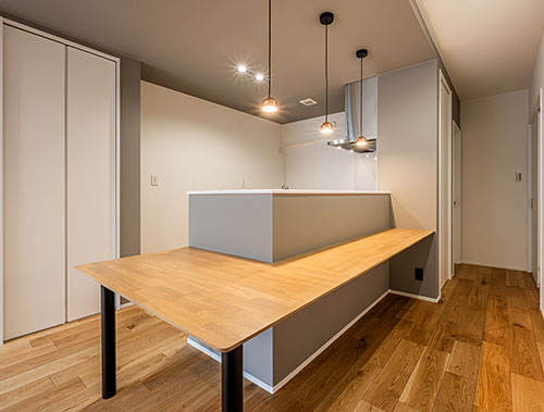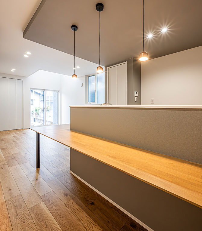 ダイニングスペースを有効活用できるように造作キッチンカウンターを備え付け、食事やパソコンコーナー、お子様の勉強を見守るスペースとして多用途性の高いカウンタースペースです。