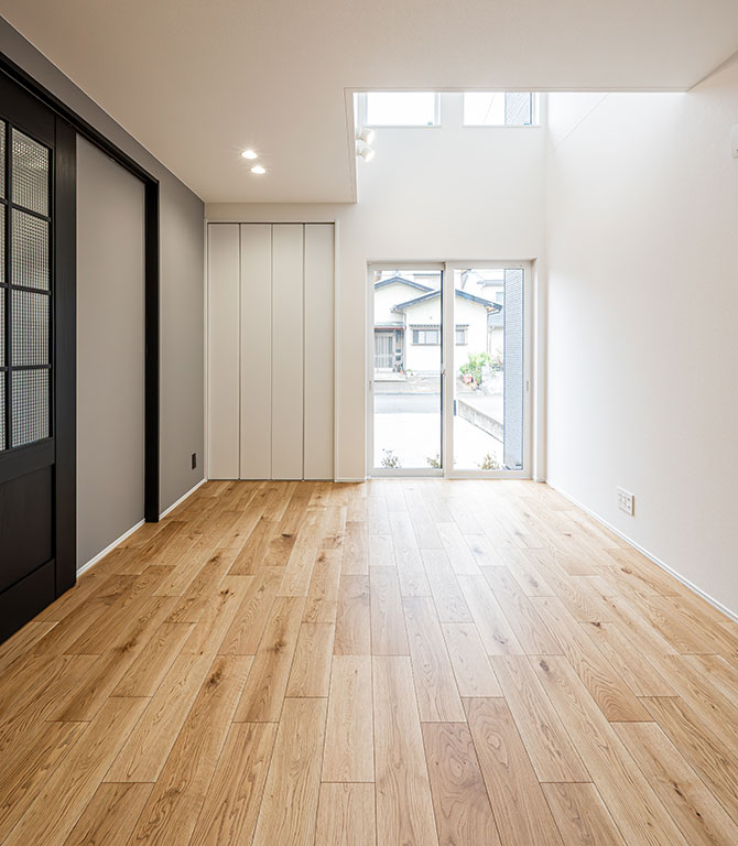 LDKに吹抜を設ける事で、間接光が安定的に採りこめ明るく開放的な空間になります。帖数以上の広がりを感じます。