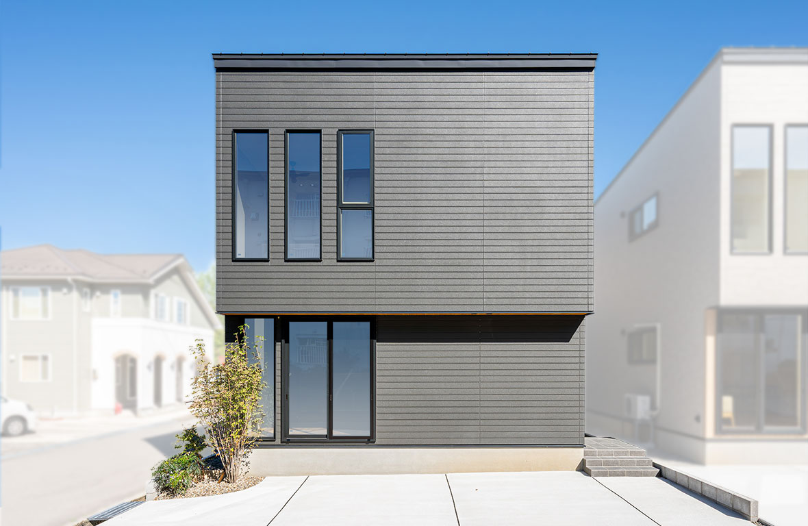 小幅の板を重ね張りしたようなブラックカラーの外壁で統一し、クールモダンなデザインに天然木の柔らかさが融合した外観デザインです。