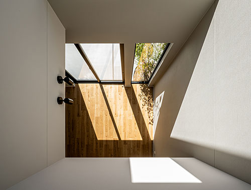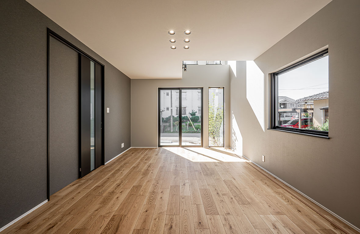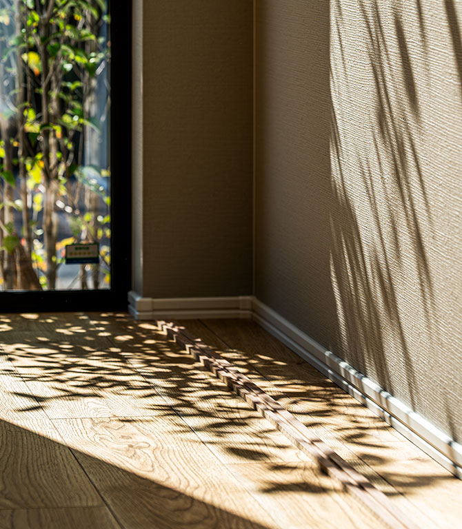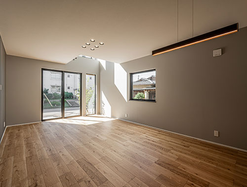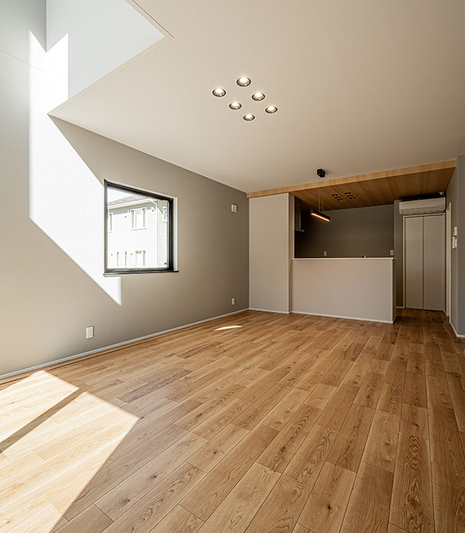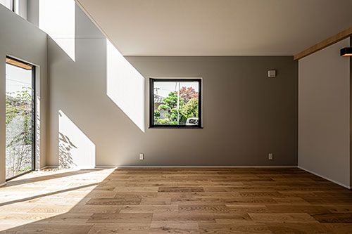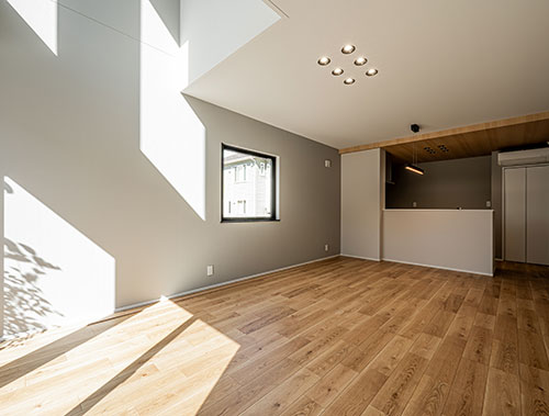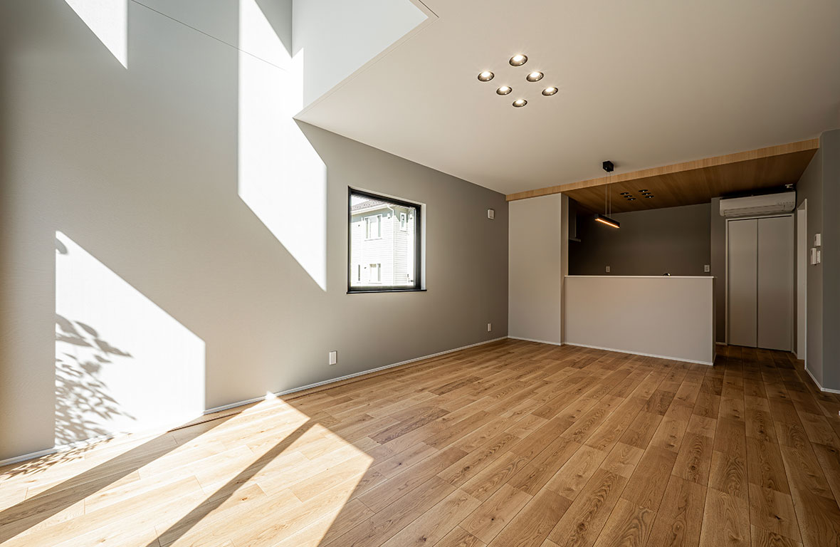 LDKに吹抜を設ける事で、間接光が安定的に採りこめ明るく開放的な空間になります。帖数以上の広がりを感じます。南から差し込む光の筋と草木の影が映し出される壁は、日々の暮らしに自然の気配を感じさせてくれます。