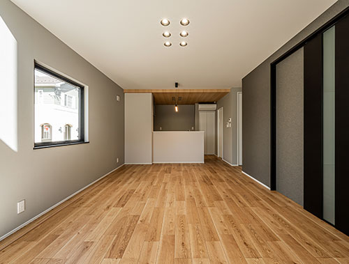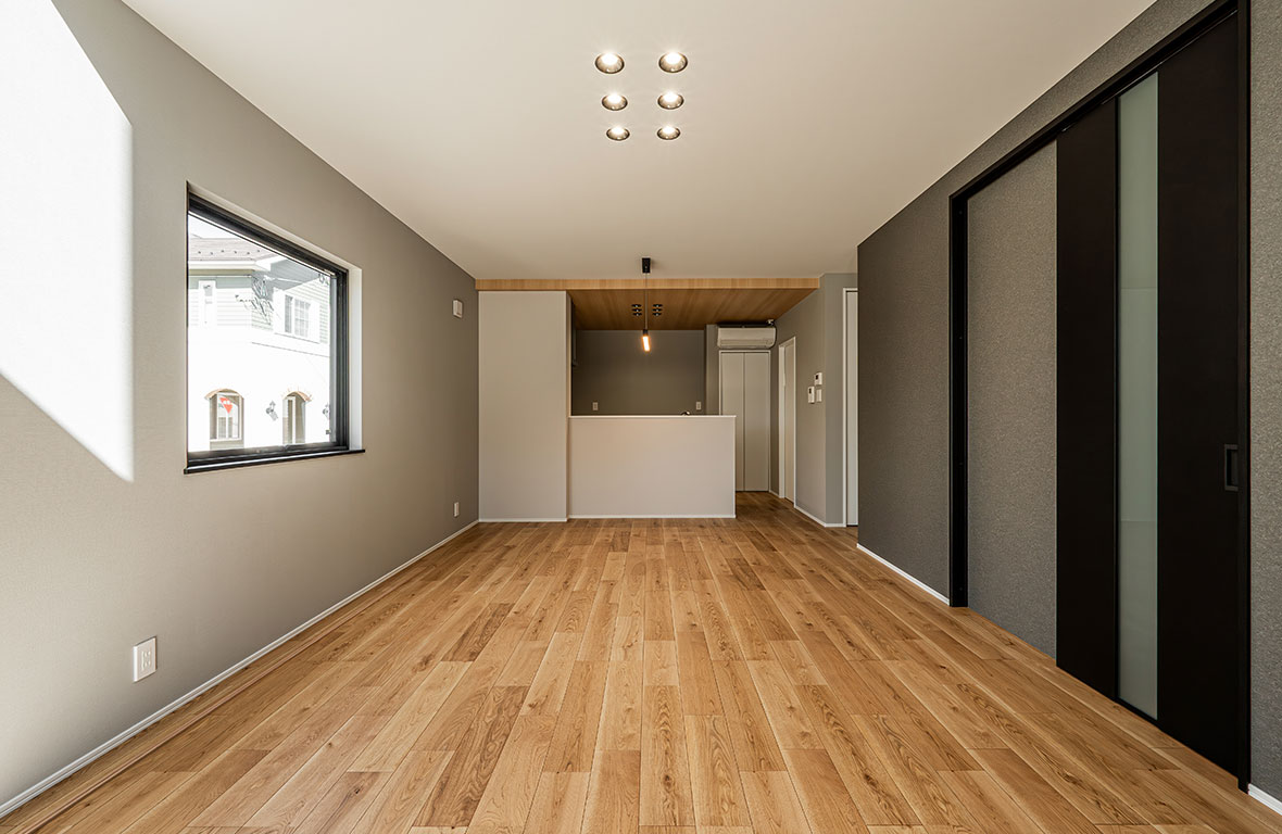 グレーを基調とした空間は上質な雰囲気をもたらします。柔らかなトーンから深みのある色合いまで、微妙な濃淡が奥行きを生み出し、暮らしの中に静かな品格を添えます。そこに差し込む光や、素材の質感が際立ち、インテリアやアートが印象的に映える空間です。窓に映る借景が四季の移ろいを感じる事ができます。
