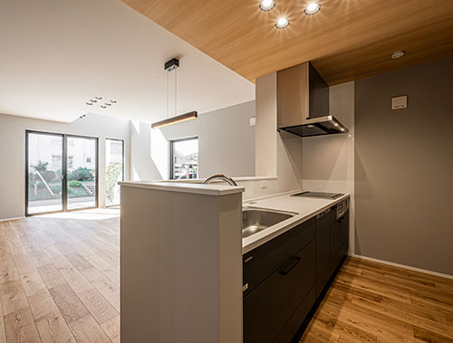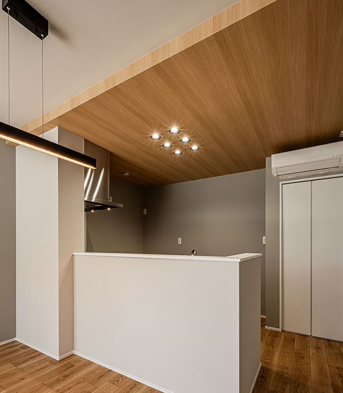 キッチンの天井を一段折り下げて木目調にすることで、木目の質感がもたらす温かみを感じさせてくれます。木のぬくもりとグレーの静かな色調を組み合わせ、主張しすぎず、そっと落ち着きを与えてくれる空間です。